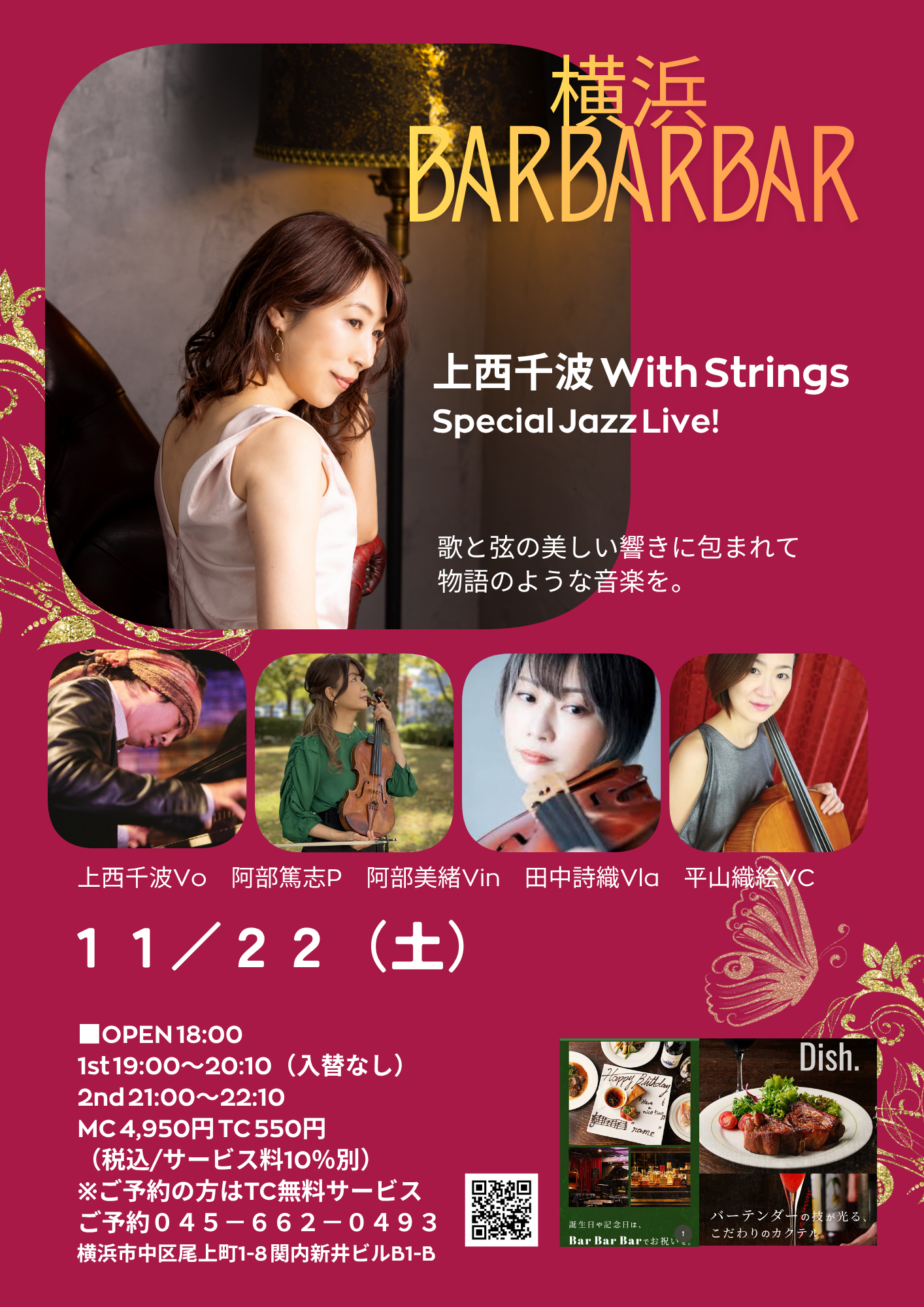■上西千波とWith Stringsのライブは、ジャズをベースにミュージカル仕立てのナンバーや映画、日本の名曲など、幅広いレパートリーが魅力!美しい弦のサウンドに包まれて、ロマンティックに冒険的に施されたアレンジも秀逸です。